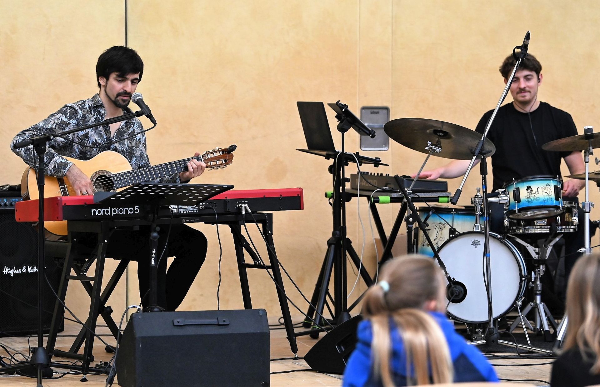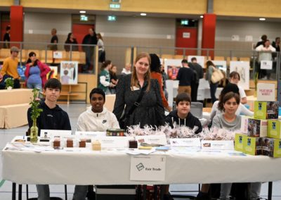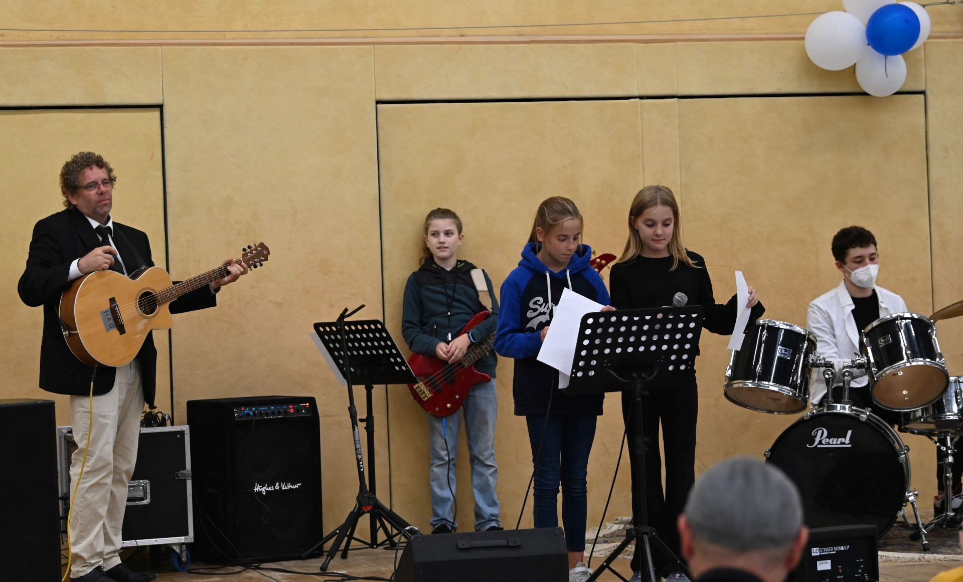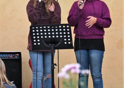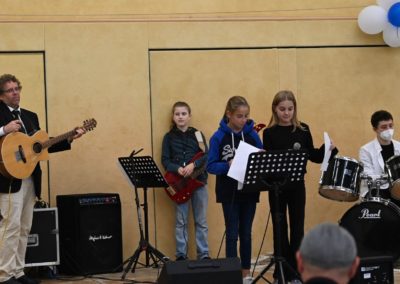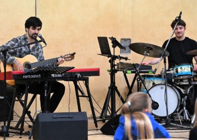 Zur sehr guten Stimmung tragen nicht zuletzt die „Live-Musik-Veranstaltungen“ des Tages bei. Eröffnet wird der Tag durch die virtuose Vorstellung eines Pianisten, Hannes Joachimi, der alle Anwesenden des offiziellen Empfangs zu entzücken weiß. Zudem erleben die Besucherströme in der Turnhalle beste Unterhaltung durch zwei schuleigene Bands unter der Leitung von Herrn Hagel (Lehrer für Sonderpädagogik), die mit ihrem Können an den Instrumenten und ihrem Gesang die Zuschauer zu begeistern wissen. Über den Nachmittag unterhalten dazu das Pop-Duo „Janson & Vogel“ in der Halle alle Schüler*Innen, Eltern, Lehrer*Innen und Gäste mit einem musikalischen Bühnenprogramm, das alle Beteiligte mit Begeisterung erfüllt.