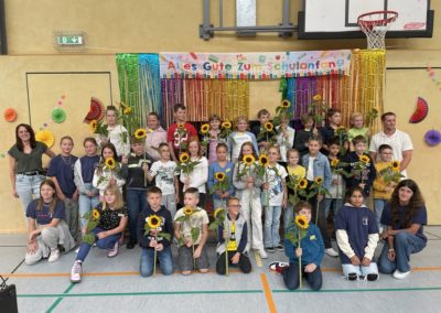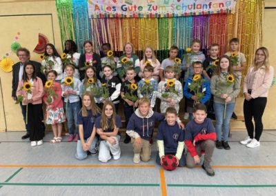 Neben den Reden und Bühnendarbietungen müssen hier unbedingt noch die vielen helfenden Hände rund um die Einschulungsfeier und die ersten Schritte an der neuen Schule erwähnt werden: Da wären die Klassenpaten, die, begleitet von Frau Rohde-Wanders, wichtige Ansprechpartner*innen und Orientierungshilfen für unsere neuen Schüler*innen darstellen. Außerdem ist noch die 6d von Frau Milz-Pres zu erwähnen, die während der Feier den Getränkeausschank übernommen haben und außerdem tatkräftig bei der Vorbereitung geholfen haben.