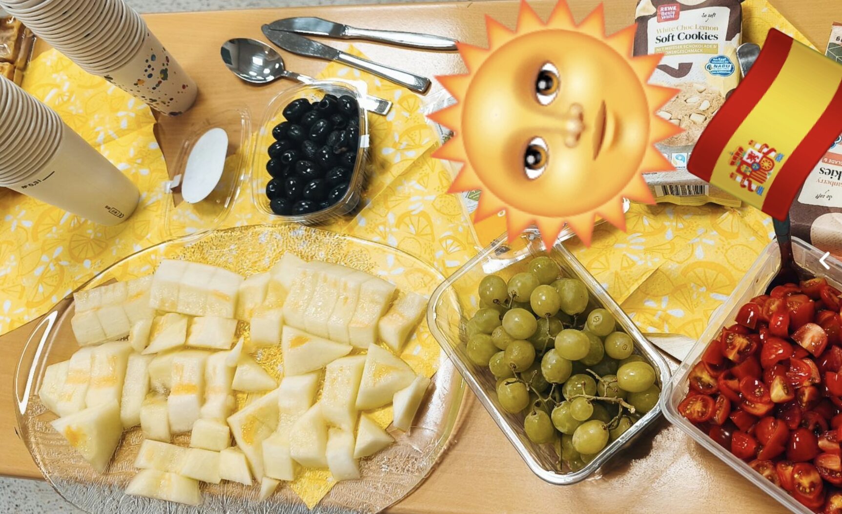 Zum Abschluss ihres ersten Spanischlernjahres hat der 9. Jahrgang gemeinsam mit ihrer Kurslehrerin Frau Lütkenhaus ein spanisches Frühstück veranstaltet begleitend von spanischer Musik.